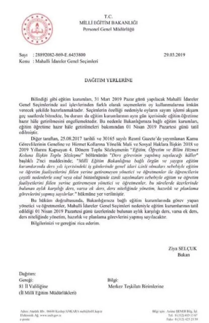 Öğrencilerin ve velilerin beklediği tatil haberi Valilik açıklamasıyla gerçekleşti. 31 Mart yerel seçimlerinin ertesinde, 1 Nisan Pazartesi günü okullar tatil edildi. Valilik açıklamasında şöyle denildi 31 Mart'ta gerçekleştirilecek olan yerel seçimler dolayısıyla 1 Nisan Pazartesi günü tüm ilk ve orta dereceli okullar tatil edildiği belirtildi. Bu arada Milli Eğitim Bakanlığı'nın yayınladığı takvime göre, 2018-2019 eğitim öğretim döneminde okullar 14 Haziran 2019 Cuma kapanacak.