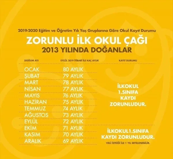 2013'te yılının ocak, şubat, mart, nisan, mayıs, haziran, temmuz, ağustos ve eylül aylarında doğan ve dolayısıyla Eylül 2019 itibarıyla 72-80 ay aralığında olan çocukların ilkokul 1. sınıfa kaydı zorunlu olacak. Aynı yılın ekim, kasım, aralık aylarında dünyaya gelen 69-71 aylık çocuklar için de ilkokul 1. sınıfa kayıt zorunlu olacak ama bu velinin isteğiyle bir yıl ertelenebilecek.
