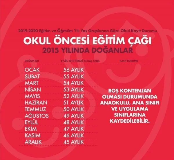 33-35 aylık çocukların ise kreş ve gündüz bakım evlerine kaydı yapılacak. 2015'te doğan 45-56 ay aralığındaki çocuklar ise boş kontenjan olması durumunda anaokulu, ana sınıfı ve uygulama sınıflarına kaydedilebilecek.
