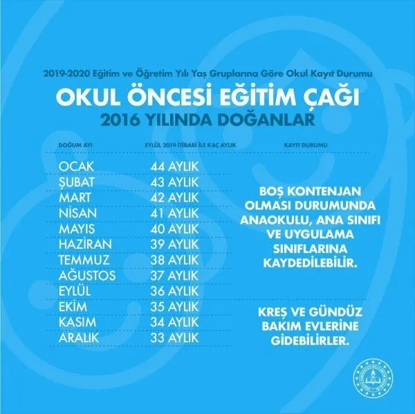 Paylaşılan videoda, yeni düzenleme sonrasında 2019-2020 eğitim-öğretim yılı yaş gruplarına göre okul kayıt durumuna ilişkin bilgilendirici tablolar yer aldı. Buna göre, Eylül 2019 itibarıyla 36-44 ay arasında olan 2016 doğumlu çocuklar boş kontenjan olması durumunda anaokulu, ana sınıfı ve uygulama sınıflarına kaydedilebilecek.