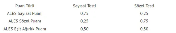 Ağırlıklı puanların hesaplanmasında testlerin ağırlıkları aşağıdaki gibi olacaktır: