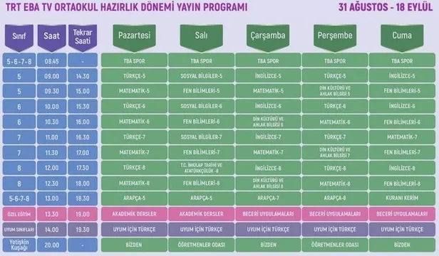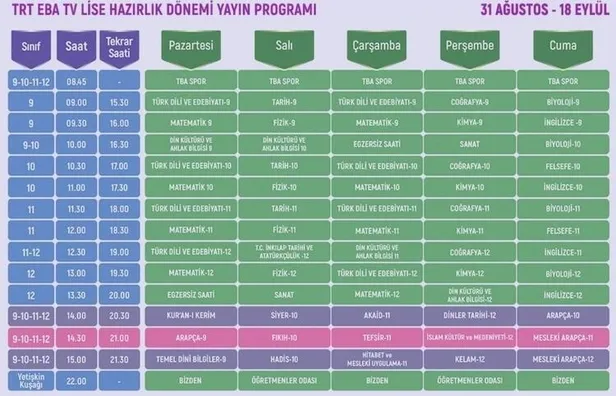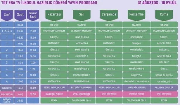 Geçen eğitim-öğretim yılının ikinci dönemine ait derslerin kritik konu ve kazanımlarına dair ders içerik videoları, TRT EBA İlkokul TV, TRT EBA Ortaokul TV ve TRT EBA Lise TV kanallarında yayınlanacak. Bu dersler, yeni öğretim yılına başlarken öğrencilerin hazır bulunuşluk düzeylerini güçlendirmek, eksiklerini gidermeye yardımcı olmayı amaçlıyor.