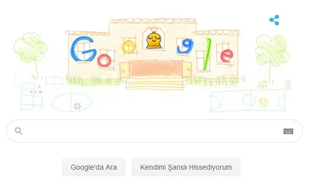 Google tarafından hazırlanan görselde, okul gözüküyor. Okulların açıldığının simgeleyen görselde, çalan zil sonrası "Google" harfleri okulun içine giriyor.
