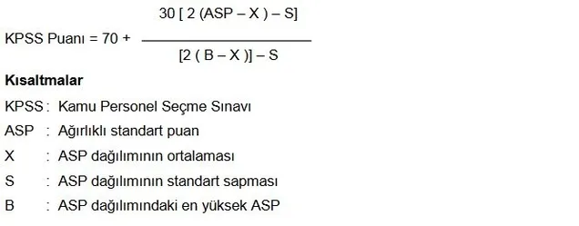Adayların ASP'leri kullanılarak, o rtaöğretim düzeyi için KPSSP94 puanları hesaplanacaktır. KPSS puanlarının hesaplanmasında aşağıdaki formül kullanılacaktır. Böylece her KPSS puan türü için 100 üzerinden KPSS puan dağılımı elde edilmiş olacaktır. B Grubu Kadrolara yerleştirme ÖSYM tarafından KPSS puanları esas alınarak yapılacaktır.