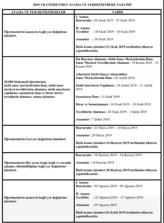 Açıklanan takvimde 2019 yılı öğretmenlerin mazerete bağlı, il içi ve iller arası yer değiştirme işlemlerine ilişkin süreç de yer aldı. Buna göre, öğretmenlerin Ocak dönemi mazerete bağlı atamaları 18 Ocak'ta; Ağustos dönemi mazerete bağlı atamalar ise 29 Ağustos 2019 tarihinde yapılacak.