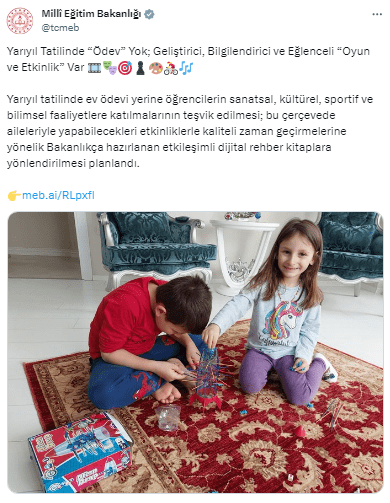 MEB tarafından yapılan açıklamada, yarıyıl tatilinde öğrencilere ev ödevi verilmemesi, onların sanatsal, kültürel, sportif ve bilimsel faaliyetlere katılmalarının teşvik edilmesi vurgulanıyor. Ailece yapılacak etkinliklerle kaliteli zaman geçirmeleri, yetenek ve ilgi alanlarına yönelik faaliyetlere katılmaları, kitap okuma, film izleme, tiyatro ve müze ziyaretleri gibi toplumsal yardımlaşma ve dayanışmayı destekleyici faaliyetler yapmaları öneriliyor.