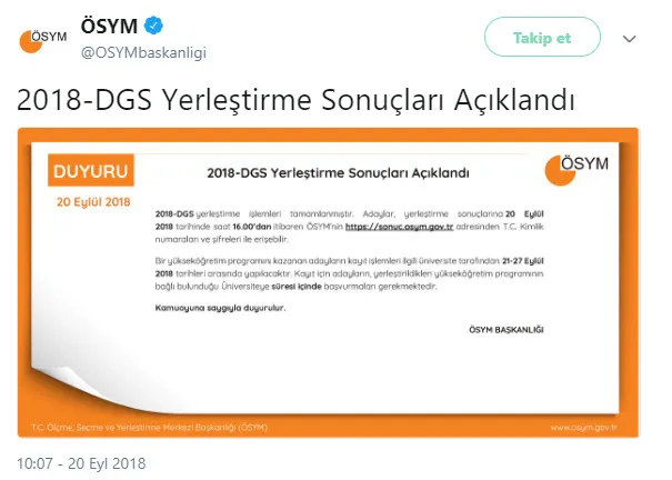 DGS tercih sonuçları 'https://sonuc.osym.gov.tr/' üzerinden sorgulanabiliyor.