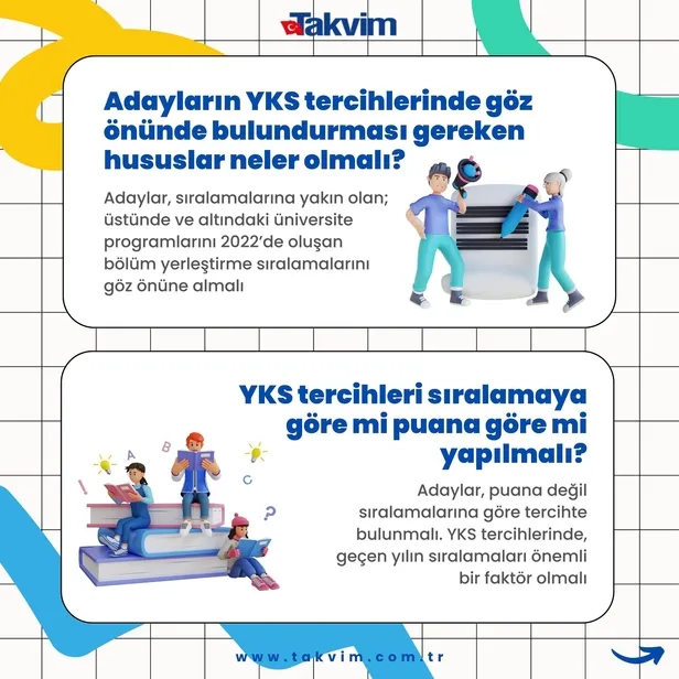 Adayların tercihlerini belirlemeden önce, tercih süresi içinde ÖSYM'nin internet adresinden yeniden yayımlanacak 2023-YKS Yükseköğretim Programları ve Kontenjanları Kılavuzu'nu dikkatle incelemeleri ve ÖSYM'den yapılan duyuruları takip etmeleri gerekiyor.