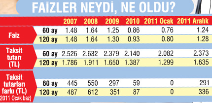 Konut kredisi alacaklar dikkat! 2011 yılı başında 0.78 olan faiz, Aralık'ta 1.27'lere çıktı 120 ay vade ile 100 bin lira konut kredisi alan bir vatandaş 40 bin lira fazla ödeyecek...