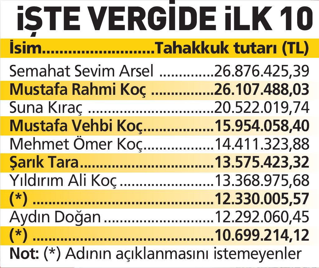 Maliye Bakanlığı Gelir İdaresi Başkanlığı, 2012 yılı vergilendirme dönemine ilişkin verilen Gelir Vergisi beyanları sonucunda en çok vergi beyan eden ilk 100 mükellefi açıkladı. Listenin ilk 5 sırası Koç Ailesi'nden oluştu. Türkiye'nin Gelir Vergisi rekortmeni, 2012 yılı için 26 milyon 876 bin 425 lira vergi tahakkuk ettirilen Koç Holding Yönetim Kurulu Üyesi Semahat Sevim Arsel oldu. Arsel, 2011'de de 33.6 milyon lira ile vergi rekortmeni olmuştu. Son 2 yıl da 2'nci ve 3'üncü sıralarda yer alan Koç Holding Şeref Başkanı Rahmi Koç ile yine aynı aileye mensup Suna Kıraç'a tahakkuk ettirilen vergi tutarları da düştü. Rahmi Koç'un vergisi 7.5 milyon, Kıraç'ın vergisi ise 4.7 milyon lira azaldı. 2011 listesinde 5'inci, 2012 listesinde 4'üncü sırada olan Koç Holding Yönetim Kurulu Başkanı Mustafa Koç'a tahakkuk ettirilen vergi 2.3 milyon lira indi. 7'nci sıradan 5'inci sıraya çıkan Koç Holding Yönetim Kurulu Başkan Vekili Ömer Koç'un vergisi 1.5 milyon lira, 6'ncı sıradan 7'nci sıraya gerileyen Koç Holding Yönetim Kurulu Üyesi Ali Koç'un vergisi 3 milyon lira seviyelerinde azaldı. Bu arada, 2011'de ilk 10'da olmayan ENKA Şirketler Grubu Fahri Başkanı Şarık Tara 13.6 milyon lira ile 2012 listesine 6'ncı sıradan, Aydın Doğan Vakfı Kurucu ve Onursal Başkanı Aydın Doğan ise 12.3 milyon lira ile yine 2012 listesine 9'uncu sıradan girdi.