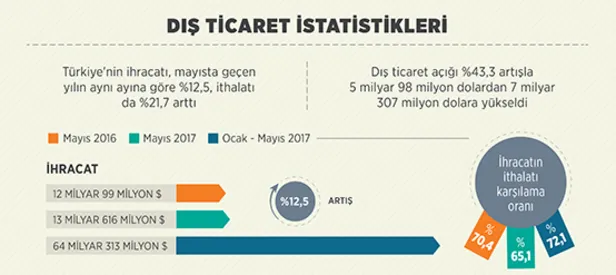 Buna göre, ihracat mayısta geçen yılın aynı ayına göre yüzde 12,5 artışla 13 milyar 616 milyon dolara ulaştı. Aynı dönemde ithalat ise yüzde 21,7 yükselerek 20 milyar 923 milyon dolar oldu.İhracatın ithalatı karşılama oranı, geçen yılın mayıs ayında yüzde 70,4 iken bu yılın aynı ayında yüzde 65,1'e düştü.
