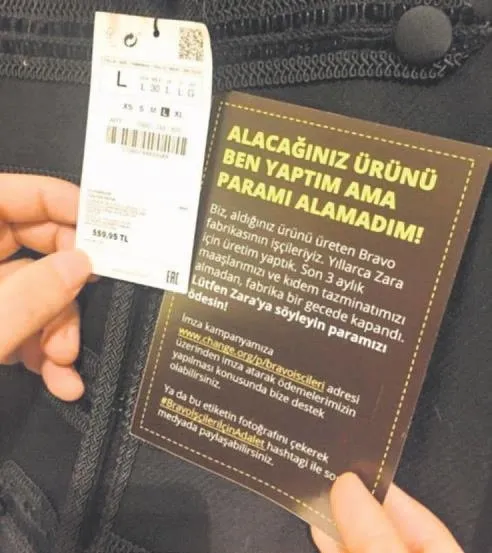 Dünyanın en büyük markalarından Zara'nın Türkiye ürünlerine eklenen etiketler dikkat çekti. İşçiler alacakları için etiketlere, 'Paramızı ödeyin' notu ekledi. Bravo hazır giyim fabrikasında Zara, Next ve Mango'ya üretim yapan işçiler; fabrikanın bir gecede boşaltılıp, sahibinin kaçması üzerine, son 3 maaşlarını, kıdem ve ihbar tazminatlarını alamadı. İşçiler alacakları için Zara, Next ve Mango'nun kapısını çaldı. Zara'nın uluslararası sendika ile yaptığı sözleşmede tedarik zincirlerindeki işçilerin alacaklarından sorumlu olduğunu resmi olarak kabul etmesine rağmen, 1 yıldır işçilerin parasını vermemek için direndiği belirtildi. Bravo işçileri de seslerini duyurmak için İstanbul'daki Zara mağazalarına giderek etiketlere; "Biz, aldığınız ürünü üreten Bravo fabrikasının işçileriyiz. Yıllarca Zara'ya üretim yaptık. 3 aylık maaşlarımızı ve tazminatımızı alamadan, fabrika kapandı. Lütfen Zara'ya söyleyin, paramızı ödesin!" notunu düştü.