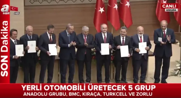 Cumhurbaşkanı Recep Tayyip Erdoğan, "Türkiye'nin Otomobili Ortak Girişim Grubu Tanıtım Toplantısı"nda yaptığı konuşmada, Türkiye'nin otomobilini yapacak Ortak Girişim Grubu'nda Anadolu Grubu, BMC, Kıraça Holding, Turkcell Grubu ve Zorlu Holding'in bulunduğunu açıkladı.