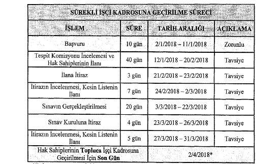 TAŞERON KADRO BAŞVURULARI : Taşeron işçiler 2 Ocak 2018 (bugün) ile 11 Ocak 2018 tarihleri arasında başvuru yapacaklar. Bunun akabinde başvuran işçilerin başvuruları 12 Ocak ile 20 Şubat 2018 tarihleri arasında 40 gün incelenecek. İtiraz etmek isteyenler ise 21 Şubat ile 23 Şubat 2018 tarihleri arasında bu haklarını kullanabilecekler. İtirazların incelenmesi ve kadroya geçen işçilerin kesin ilan listeleri 24 Şubat ve 2 Mart arasında askıya çıkacak.