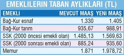 OCAK ayı zam oranının açıklanmasının ardından emeklilerin taban aylıkları da belli oldu. Maliye Bakanlığı'ndan yapılan açıklamaya göre; en düşük maaşlar memur emeklilerinde bin 871 liradan bin 978 liraya, SSK emeklilerinde bin 485 liradan bin 570 liraya, esnaf Bağ-Kur emeklilerinde bin 330 liradan bin 405 liraya yükseldi. Türkiye Emekliler Derneği (TÜED) Genel Başkanı Kazım Ergün de 2000'den önce emekli olan SSK'lıların taban aylıklarının ek ödeme dahil 935 lira 60 kuruşa çıktığını, en düşük maaşın Bağ-Kur tarım emeklilerinde ise 988 lira 91 kuruş olduğunu kaydetti.