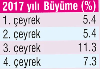 Fetullahçı Terör Örgütü'nün (FETÖ) hain darbe girişiminin etkisiyle 2016 yılının üçüncü çeyreğinde 27 çeyrek sonra ilk kez küçülen Türkiye ekonomisi, hükümetin ekonomiyi canlandırmak için attığı istihdam ve Kredi Garanti Fonu (KGF) başta olmak üzere teşviklerin etkisiyle, 2017'de parmak ısırtan büyümeye imza attı. Türkiye ekonomisi 2017'nin son çeyreğinde yüzde 7.3, yılın tamamında ise yüzde 7.4 büyüdü. Böylece Türkiye ekonomisi, 2016'da darbe girişiminin olduğu üçüncü çeyrekteki gerilemesinin ardından 5 çeyrek üst üste büyüme kaydetti. Türkiye ekonomisi, geçen yıl yakaladığı yüzde 7.4'lük büyüme oranıyla G20, Ekonomik İşbirliği ve Kalkınma Örgütü (OECD), Avrupa Birliği (AB) ülkelerine fark attı. AB ortalamasının yaklaşık 3 katı büyüyen Türkiye, dünyanın en hızlı gelişen ekonomilerinden Çin ve Hindistan'ı geride bırakarak G20'de zirveye çıkarken, OECD ve AB ülkeleri arasında ise ikinci sırada yer aldı. Türkiye, dünya genelinde ise 2017 büyümesiyle dördüncü, üçüncü çeyrek büyümesiyle ikinci oldu. Türkiye ekonomisinin büyüklüğü 851 milyar dolar olurken, kişi başı gelir 10 bin 597 olarak gerçekleşti. Büyümenin temelini vatandaşın tüketimi ile inşaat yatırımları oluşturdu. Tüketimini geçen yıl yüzde 6.1 artıran vatandaş, yüzde 7.4'lük büyümenin 3.74 puanını yani yarısını tek başına karşıladı. Toplam yatırımlarda yıllık artış yüzde 7.31 oldu. Büyümenin 2.3 puanı yatırım ve net ihracattan geldi.