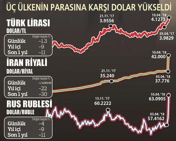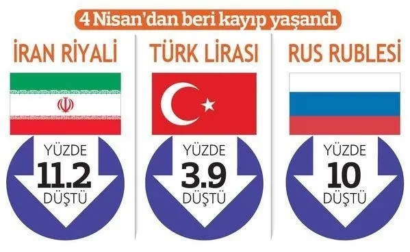 Öyle ki İran Riyali önceki gün yüzde 58 değer kaybı ile dolara karşı 37 binden 62 bine kadar çıkarken hükümet riyali 42 bine sabitlemek zorunda kaldı. Böylece riyaldeki değer kaybı yüzde 11.2'de tutuldu. Rus Rublesi ise 3 Nisan'da 57.41'deyken dün değer kaybı yüzde 10'u buldu ve 1 doların karşılığı 63.09 rubleye kadar çıktı. Türk Lirası da o günden sonra yüzde 3.6 değer yitirdi ve dolar dün 4.1265 TL'ye çıkarak yeni rekorunu kırdı. Aynı üçlünün aynı amaçla 11 Kasım 2017'de Soçi zirvesinde bir araya gelmesi sırasında da bu ülkelerin döviz kurlarında benzer hareketler olması garip bir tesadüf olarak görüldü. Bu üç ülkenin dışında rublenin değer yitirmesinin etkisi ile Brezilya Reali ve Güney Afrika Randı'nda da kayıplar oldu ancak bu iki ülke para birimlerindeki kayıp çok sınırlı kaldı.
