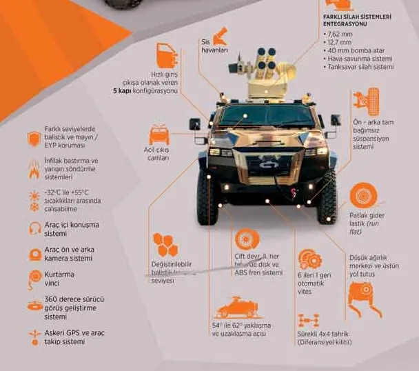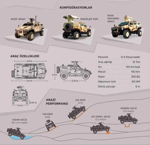 Nurol Makina'nın özgün olarak ürettiği askeri şasi üzerine tasarlanan araç, bağımsız süspansiyonlu, sürekli 4 çeker, kendinden CTIS (merkezi lastik şişirme) sistemine sahip bulunuyor.