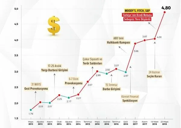 Tam bu noktada dünya üzerinde büyük bir spekülasyon krizi yaşandı. 2,87 seviyesinde seyreden dolar kısa sürede kuvvetli tırmanışa başladı. Özellikle ABD'de FETÖ temelli Halkbank kumpasıyla birlikte 3,86'ya yükselen dolar, ekonomiye darbe vurdu. Yükselişini sürdüren dolara karşı önemli adımlar atıldı, ancak bu sefer de devreye uluslararası derecelendirme kuruluşları girdi. Kredi notunu düşüren kurumların bu hamlesi sonrasında dolar 4,80 düzeyine kadar yükseldi.