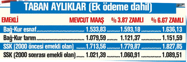 Merkez Bankası, enflasyonun yıl sonunda yüzde 13.4 olarak gerçekleşeceğini tahmin ediyor. Bu tahmine göre, 2018'in ikinci yarısında enflasyon yani SSK ve Bağ- Kur emeklilerinin Ocak zammı yüzde 3.87 olacak. Maaşlarda 39,52 ile 189,32 lira arasında artış yaşanacak. En düşük aylık bin 21 lira 39 kuruştan bin 60 lira 91 kuruşa, en yüksek maaş da 4 bin 892 lira 19 kuruştan 5 bin 81 lira 51 kuruşa çıkacak. Merkez Bankası'nın ekonomistlerle yaptığı beklenti anketinden ise, 2018 enflasyon tahmini yüzde 16.45 çıktı. Buna göre de 2018'in ikinci yarısında enflasyon yüzde 6.67 olacak. SSK ve Bağ-Kur'luların maaşında 68,12 ile 326,31 lira arasında artış yaşanacak. En düşük aylık bin 89 lira 51 kuruşa, en yüksek aylık da 5 bin 218 lira 50 kuruşa yükselecek.