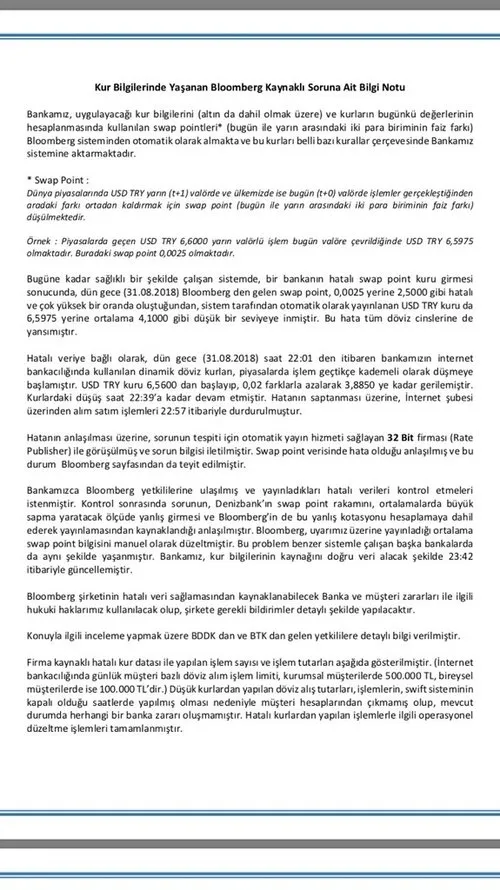 Konu ile ilgili sabah saatlerinde bir açıklama yapan Halkbank yetkilileri, "Kur bilgilerinde yaşanan Bloomberg kaynaklı soruna ait bilgi notu" başlıklı ikinci bir açıklama daha yaparak yaşanan sıkıntının Bloomberg nedeniyle olduğunu resmen duyurmuş oldu. Konu ile ilgili Halkbank, İNG Bank ve Denizbank'ın hukuki işlem başlatacağı bildirildi.