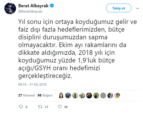 Hazine ve Maliye Bakanı Berat Albayrak, sosyal medya hesabından yaptığı paylaşımda " Yıl sonu için ortaya koyduğumuz gelir ve faiz dışı fazla hedeflerimizden, bütçe disiplini duruşumuzdan sapma olmayacaktır. Ekim ayı rakamlarını da dikkate aldığımızda, 2018 yılı için koyduğumuz yüzde 1,9'luk bütçe açığı/GSYH oranı hedefimizi gerçekleştireceğiz." dedi.