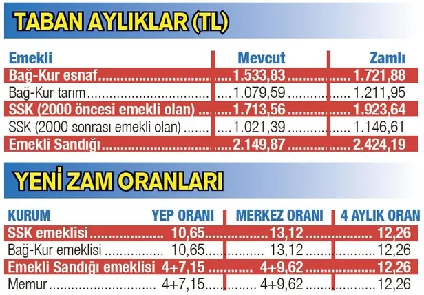 Bu oranlara göre memur ve memur emeklilerinin yıl sonu zamları ise Merkez Bankası tahminine göre yüzde 13,62 (Yüzde 4+9,62) ve Yeni Ekonomi Programı'na göre yüzde 11.15 (Yüzde 4+7,65) olmuştu.
