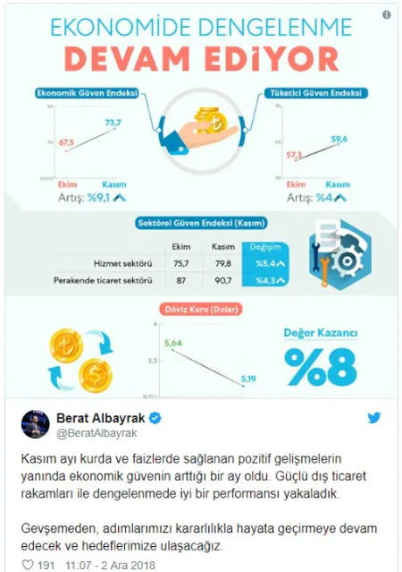 Hazine ve Maliye Bakanı Berat Albayrak sosyal medya hesabı üzerinden yaptığı paylaşımda; ""Kasım ayı kurda ve faizlerde sağlanan pozitif gelişmelerin yanında ekonomik güvenin arttığı bir ay oldu. Güçlü dış ticaret rakamları ile dengelenmede iyi bir performansı yakaladık." dedi.