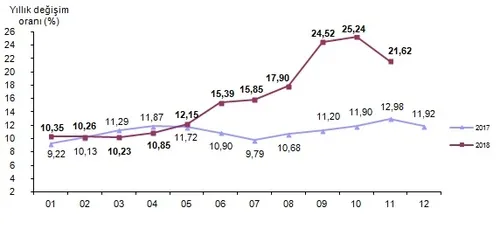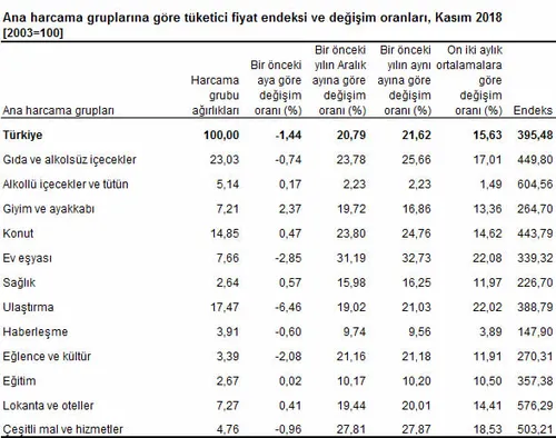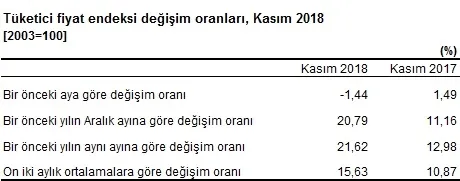 TÜFE'de (2003=100) 2018 yılı Kasım ayında bir önceki aya göre %1,44 düşüş, bir önceki yılın Aralık ayına göre %20,79, bir önceki yılın aynı ayına göre %21,62 ve on iki aylık ortalamalara göre %15,63 artış gerçekleşti.