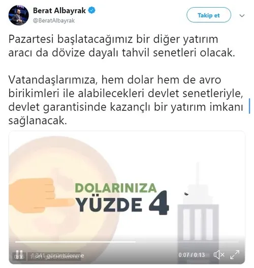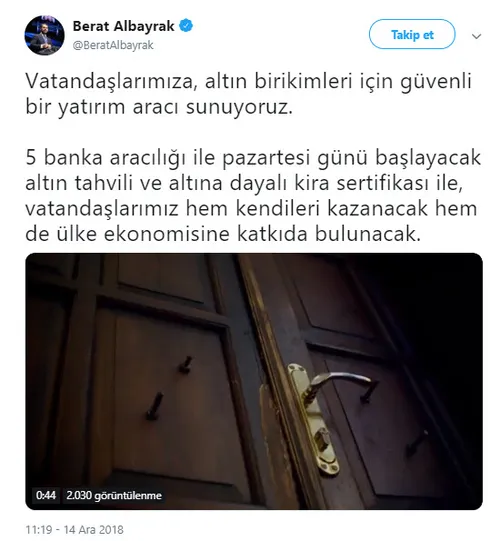Hazine ve Maliye Bakanı Berat Albayrak sosyal medya hesabı üzerinden bir mesaj yayınladı. Albayrak yayınladığı mesajda; "Vatandaşlarımıza, altın birikimleri için güvenli bir yatırım aracı sunuyoruz. 5 banka aracılığı ile pazartesi günü başlayacak altın tahvili ve altına dayalı kira sertifikası ile, vatandaşlarımız hem kendileri kazanacak hem de ülke ekonomisine katkıda bulunacak" açıklamasında bulundu.