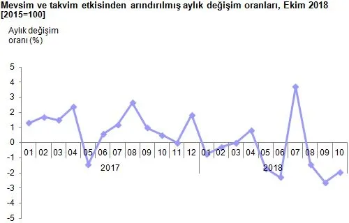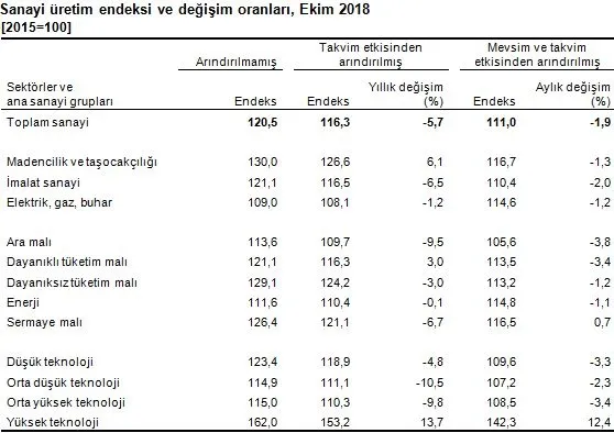 Son dakika haberine göre 2018 Ekim ayına ait sanayi üretim rakamları açıklandı. Açıklanan rakamlara göre sanayi üretiminde bir önceki aya göre yüzde 1,9; geçen yılın aynı ayına göre ise yüzde 5,7 oranında azalma yaşandı.