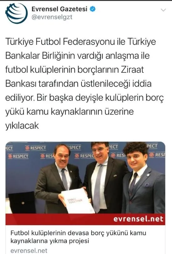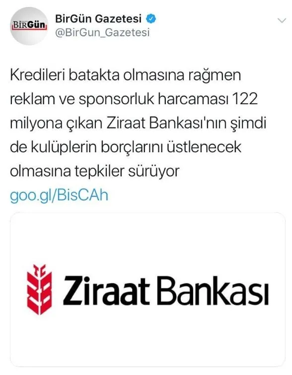 FETÖ'nün medya ayağının ortaya attığı "Ziraat Bankası, kulüplerin borçlarını ödeyecek" haberine Türkiye Bankalar Birliği'nden açıklama geldi. TBB, spor kulüplerinin borçlarının bir bankaya devredilmesinin söz konusu olmadığını duyurdu. Böylelikle FETÖ artığı Cumhuriyet, Birgün, Sözcü ve Evrensel gazetesinin yalanı bir kez daha deşifre oldu.