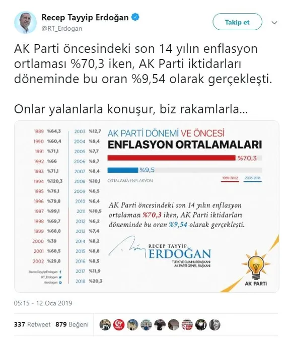 Başkan Recep Tayyip Erdoğan, yalanlarıyla halkın gözünü boyamaya çalışan CHP'ye rakamlarla yanıt verdi. Başkan Erdoğan, Twitter hesabı üzerinden yaptığı paylaşımda, "AK Parti öncesindeki son 14 yılın enflasyon ortalaması %70,3 iken, AK Parti iktidarları döneminde bu oran %9,54 olarak gerçekleşti.Onlar yalanlarla konuşur, biz rakamlarla..." ifadesini kullandı.