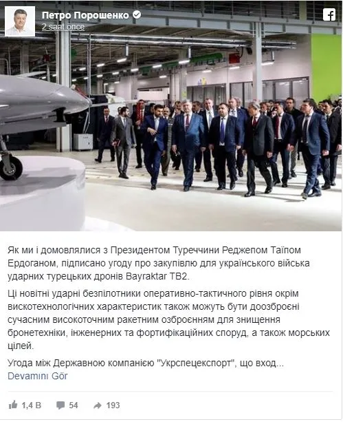 Poroşenko "Türkiye Cumhurbaşkanı Recep Tayyip Erdoğan'la anlaştığımız gibi, Ukrayna ordusuna Türk Bayraktar TB2 insansız hava aracı satın alınmasına yönelik anlaşma imzalandı" ifadelerini kullandı.