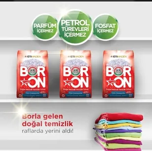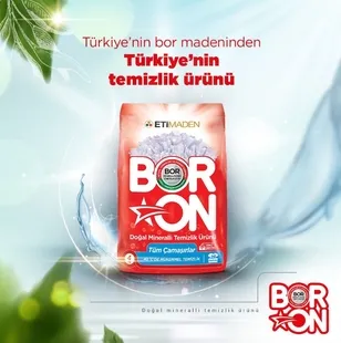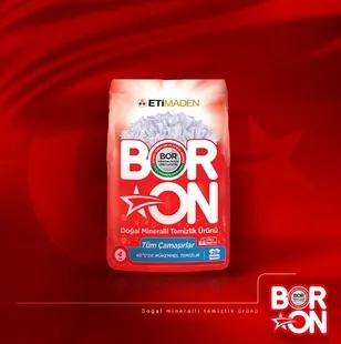 Türkiye'de bir ilk... Sadece bor madeninden üretilen temizlik ürünü BORON, dünya bor pazar lideri Eti Maden, tarafından bugün piyasaya sürülecek. Yüzde yüz doğal mineralli içerikten üretilen BORON, insan ve çevre sağlığını tehdit eden petrol türevi kimyasallar ve fosfat bileşikleri içermiyor. Ayrıca BORON, üretiminden dağıtımına kadar yerli ve milli.