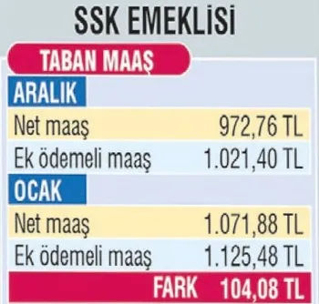 En düşük SSK emeklisi aylığı 972,76 liraydı. Bu emeklinin eline yüzde 5 oranında yani 48,64 lira ek ödemeyle birlikte bin 21 lira 40 kuruş geçiyordu. Ocak zammıyla net maaş bin 71 lira 88 kuruşa, ek ödeme de 53,60 liraya çıktı. Emeklinin eline bin 125 lira 48 kuruş geçecek. En yüksek SSK emeklisi net maaşı 5 bin 390 lira 70 kuruşa, ek ödeme de 215,63 liraya çıktı. Bu ay hesaba 5.606 lira 33 kuruş yatırılacak.