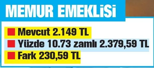 Yaklaşık 2 milyon memur emeklisine maaşları her ayın 1'i ile 5'i arasında yatırılıyor. Bu ay maaşlar, zam oranının belirlenmesi için 3 Ocak'ta açıklanan verileri beklendiği için, artış yansıtılmadan ödendi. Emekliler yüzde 10.73 zamla oluşan farklarını 25 Ocak Cuma günü hesabında gördü. Aylıklarını her ay alanlara 1 aylık, 3'er aylıklar halinde alanlardan Kasım-Aralık-Ocak döneminde alanlara 1 aylık, Aralık-Ocak-Şubat döneminde alanlara 2 aylık, Ocak-Şubat- Mart döneminde olanlara 3 aylık tutarında aylık farkı yatırıldı. Örneğin; maaşını aylık olarak almakta olan memur emeklinin aylığı 2 bin 149 liradan 2 bin 379 lira 59 kuruşa çıkmışsa, hesabına 230,59 lira zam farkı yatırılacak.