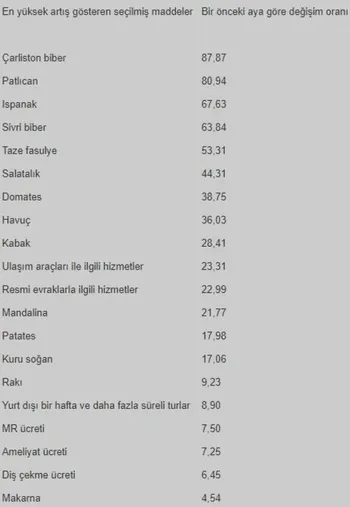 TÜİK en çok fiyatı artan ürünleri sıraladı. Buna göre; çarliston biber yüzde 87, patlıcan yüzde 81, ıspnak yüzde 68, sivri biber yüzde 64, taze fasulye yüzde 53, salatalık yüzde 44, domates yüzde 39, havuç yüzde 36, kabak yüzde 28 oranında artış gösterdi.