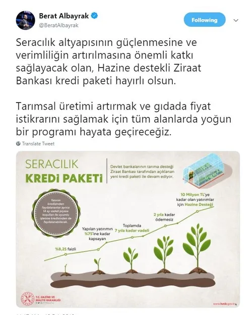 Hazine ve Maliye Bakanı Berat Albayrak, tarımsal üretimi artırmak ve gıdada fiyat istikrarını sağlamak için tüm alanlarda yoğun bir programı hayata geçireceklerini belirterek, "Seracılık altyapısının güçlenmesine ve verimliliğin artırılmasına önemli katkı sağlayacak olan Hazine destekli Ziraat Bankası kredi paketi hayırlı olsun." ifadesini kullandı.