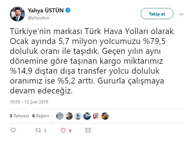 Türk Hava Yolları Basın Müşaviri Yahya Üstün, "Türkiye'nin markası Türk Hava Yolları olarak Ocak ayında 5,7 milyon yolcumuzu %79,5 doluluk oranı ile taşıdık. Geçen yılın aynı dönemine göre taşınan kargo miktarımız %14,9 dıştan dışa transfer yolcu doluluk oranımız ise %5,2 arttı. Gururla çalışmaya devam edeceğiz." dedi.