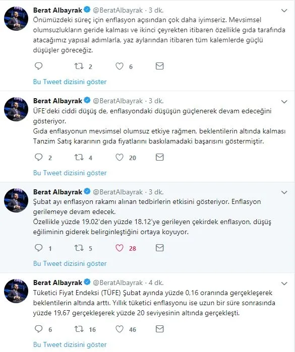 Hazine ve Maliye Bakanı Berat Albayrak, enflasyon rakamlarıyla ilgili Twitter hesabından açıklama yaptı. Bakan Albayrak, "TÜFE Şubat ayında yüzde 0,16 oranında gerçekleşerek beklentilerin altında arttı. Yıllık tüketici enflasyonu ise uzun bir süre sonrasında yüzde 19,67 gerçekleşerek yüzde 20 seviyesinin altında gerçekleşti." ifadelerini kullandı.