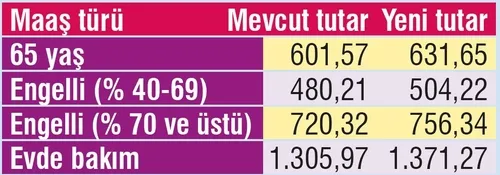 Devlet hem yaşlılara hem de engellilere çeşitli destekler sunuyor. Bunlar arasında maaş desteği başı çekiyor. Her ay verilen bu ödemeler, memur maaşları arttıkça yükseliyor. Temmuz'da memur maaşları yüzde 5 artacak, ayrıca enflasyon farkı oluşursa bu da zamma eklenecek. Yani memurlara en az yüzde 5 zam kesin. Buna göre, halen 601,57 lira olan 65 yaş aylığı, Temmuz'da 631,65 liraya çıkacak. Yüzde 40-69 engeli olanların aylığı 480,21 liradan 504,22 liraya, yüzde 70 ve üzeri engeli olanların aylığı da 720,32 liradan 756,34 liraya ulaşacak. Evde yaşlı ve engelli yakınına bakanlara ödenen bin 305 lira 97 kuruş tutarındaki aylık ise bin 371 lira 27 kuruşa yükselecek. Kendisi ve eşinin aylık geliri toplamı bin 219 liranın altında olanlar, 65 yaş aylığı alabiliyor. Hane içinde kişi başı gelir sınırı engelli aylığı için 609,67 lira, evde bakım aylığı için bin 219 lira 34 kuruş seviyesinde bulunuyor.