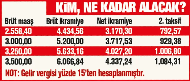 SGK primi ile gelir ve damga vergisi kesintisi yapılıyor. Her yılın ilk yarısında 26 günlük tutar ödenirken, ikinci yarısında da Cumhurbaşkanı kararıyla bir 26 günlük tutar daha veriliyor. Bu yıl asgari ücretle çalışan işçi 52 gün üzerinden net 3 bin 170 lira alacak.