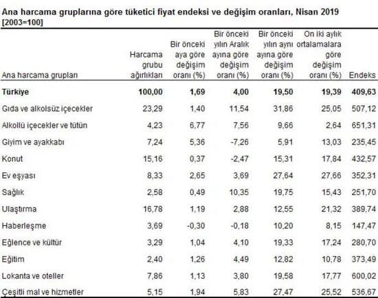 Ana harcama grupları itibariyle 2019 yılı Nisan ayında endekste yer alan gruplardan, giyim ve ayakkabıda yüzde 5,36, ev eşyasında yüzde 2,65, çeşitli mal ve hizmetlerde yüzde 1,94 ve gıda ve alkolsüz içeceklerde yüzde 1,40 artış gerçekleşti.