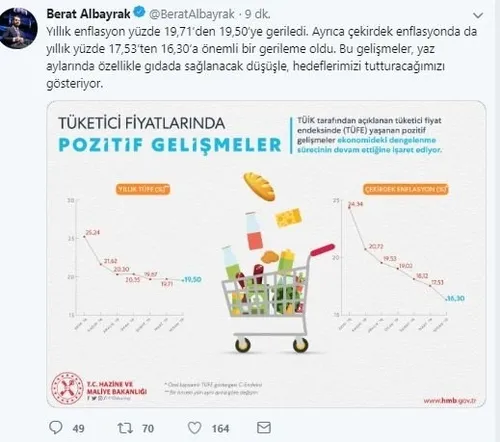Hazine ve Maliye Bakanı Berat Albayrak'ten bugün açıklanan enflasyon rakamlarıyla ilgili Twitter hesabından paylaşım yaptı.