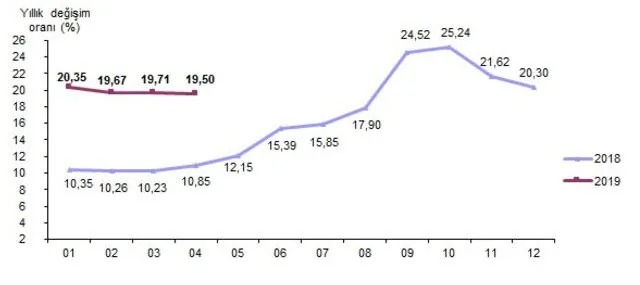 İşlenmemiş gıda ürünleri, enerji, alkollü içkiler ve tütün ile altın hariç TÜFE'de 2019 yılı Nisan ayında bir önceki aya göre yüzde 1,45, bir önceki yılın Aralık ayına göre yüzde 1,77, bir önceki yılın aynı ayına göre yüzde 16,78 ve on iki aylık ortalamalara göre yüzde 18,48 artış gerçekleşti.