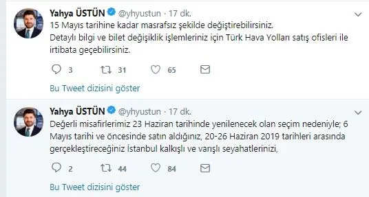"Değerli misafirlerimiz 23 Haziran tarihinde yenilenecek olan seçim nedeniyle 6 Mayıs tarihi ve öncesinde satın aldığınız, 20-26 Haziran 2019 tarihleri arasında gerçekleştireceğiniz İstanbul kalkışlı ve varışlı seyahatlerinizi, 15 Mayıs tarihine kadar masrafsız şekilde değiştirebilirsiniz.