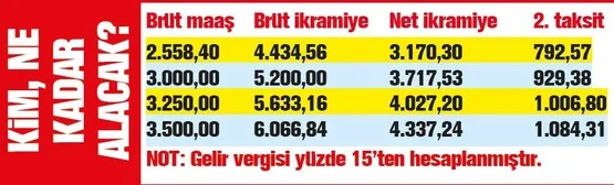 Kamu işçileri için Mayıs ikramiye ayı olacak. 31 Mayıs'ta 13 günlük ilave tediye (ikramiye) hesaplara yatırılacak. İkramiye; fazla mesai, yol ve yemek gibi ilave ödemeler olmaksızın hesaplanan brüt ücretin 52 günlük tutarı kadar oluyor. İkramiyeden SGK primi ile gelir ve damga vergisi kesintisi yapılıyor. Yılın ilk yarısında 26 günlük tutar ödenirken, ikinci yarısında da bir 26 günlük tutar daha ödeniyor. 26 günlük tediye de 2 taksitte veriliyor. Asgari ücretle çalışan bu yıl 52 gün üzerinden net 3 bin 170 lira ikramiye alacak. Ocak'ta 13 günlük tutar 792,57 lira yatırılmıştı, 31 Mayıs'ta da aynı tutarda ödeme yapılacak.