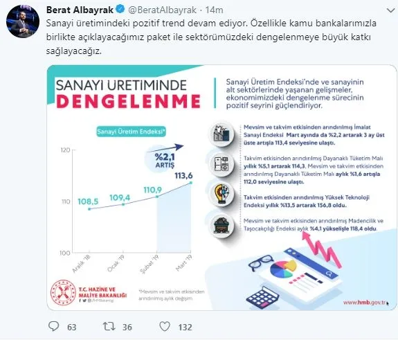 Sanayi üretimi verileriyle ilgili Twitter hesabından açıklama yapan Hazine ve Maliye Bakanı Berat Albayrak "Sanayi üretimindeki pozitif trend devam ediyor. Özellikle kamu bankalarımızla birlikte açıklayacağımız paket ile sektörümüzdeki dengelenmeye büyük katkı sağlayacağız." dedi.
