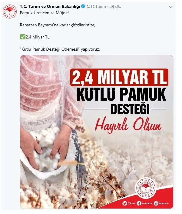 Bakanlığın Twitter hesabı üzerinden yapılan açıklamada Kütlü Pamuk Destek Ödemesi olarak 2.4 milyar lira, Yağlık Ayçiçeği Desteği Ödemesi 622 milyon lira, Çiğ Süt Destekleme Ödemeleri için de 385 milyon lira ödeneceği belirtildi.